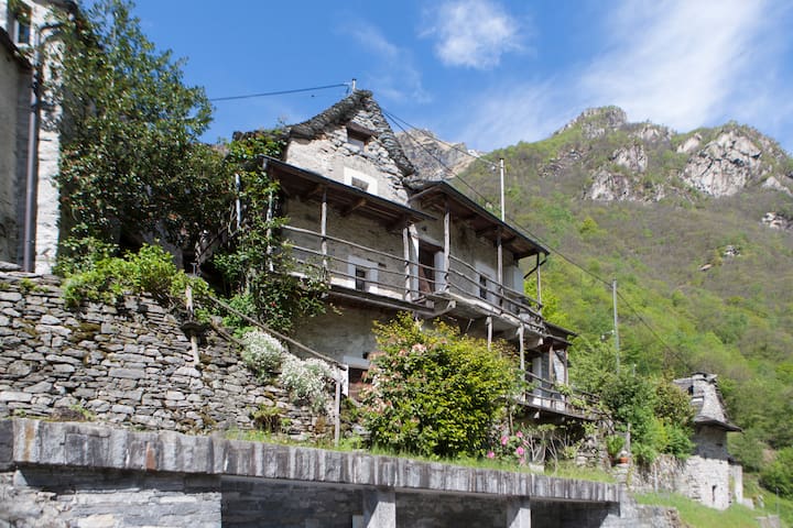 Ursprünglich erhaltenes typisches Tessiner-Rustico im Dörfchen Corippo (Verzascatal) an ruhiger Lage mit 2 gedeckten Veranden und grossem Garten (95 qm) mit Pergola und Steintisch