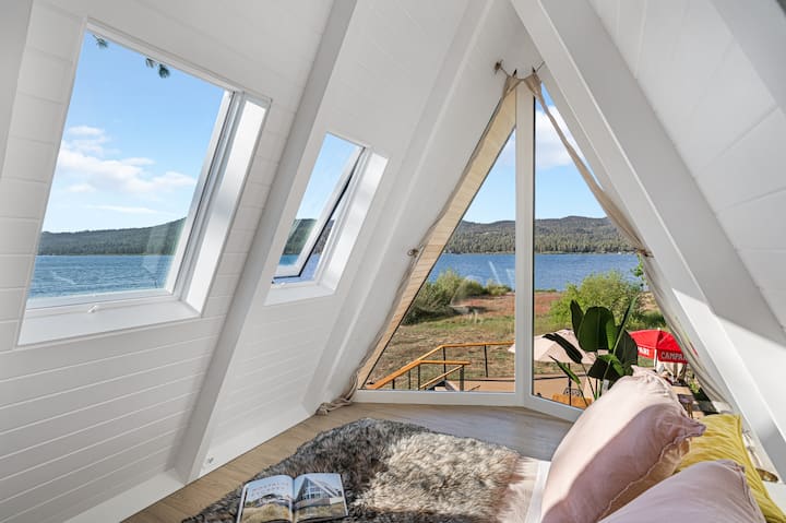 This bedroom showcases a queen-size bed and embodies the quintessential A-Frame design with its clean and modern lines. Two large skylights provide enchanting lake views during the day and an opportunity for stargazing at night. The room has been completely remodeled, and two custom floor-to-ceiling windows offer incredible lake and mountain vistas.