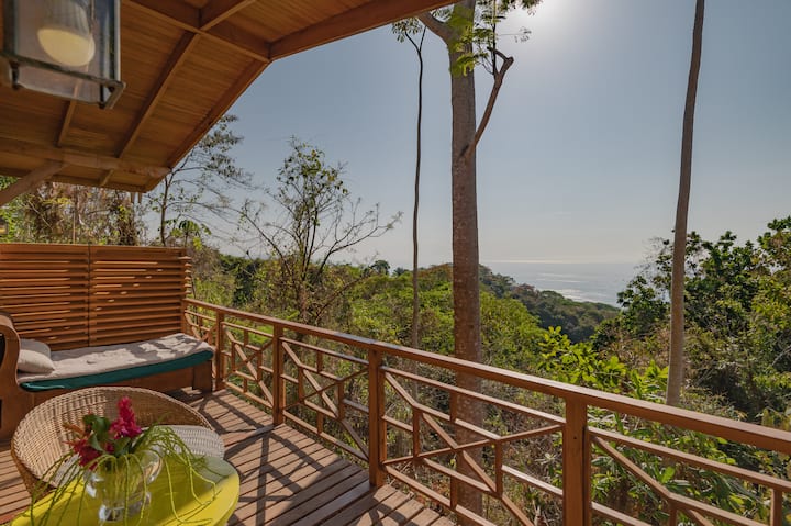 If you take a short private path around the pool, you will arrive to the Jungla Suite. This suite can be rented with the main house and can accommodate up to 3 people. Ideal for visits, small family who joins the larger group or a couple this room has a queen and a single bed, a private bathroom with a beautiful outdoor shower overlooking the ocean, coffee maker and small fridge, outdoor furniture and eating area in the ocean view terrace with a day bed. This is the perfect gateway from your gateway.