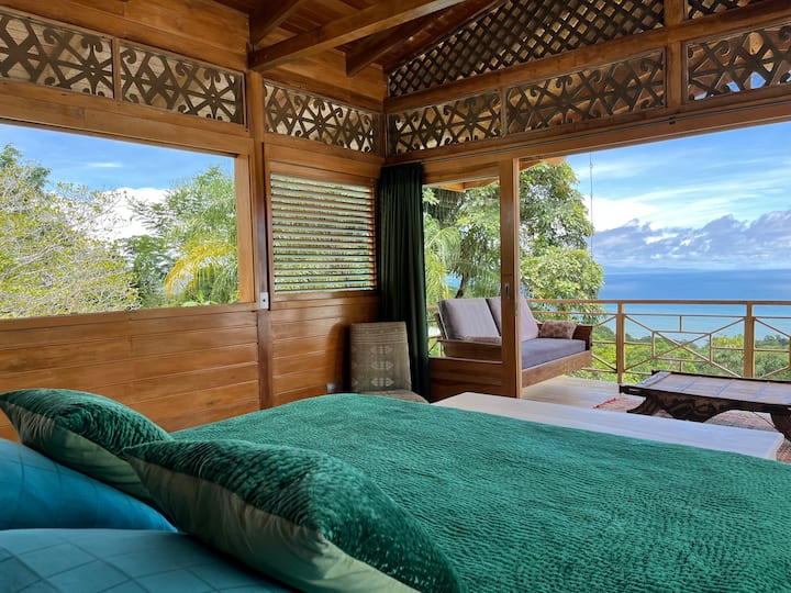 The stairs by the side of the kitchen will lead you to the excepcional master bedroom with a king size bed and en-suite bathroom, 2 washbasins, bathtub and shower. A spacious wardrobe and accent furniture and chairs complete this room. You can watch the whales playing during the whale season and dream under the full moon or the welcoming sunrise, the master bedroom's private balcony with day bed and furniture is a viewpoint to the jungle and ocean and can hardly be better.