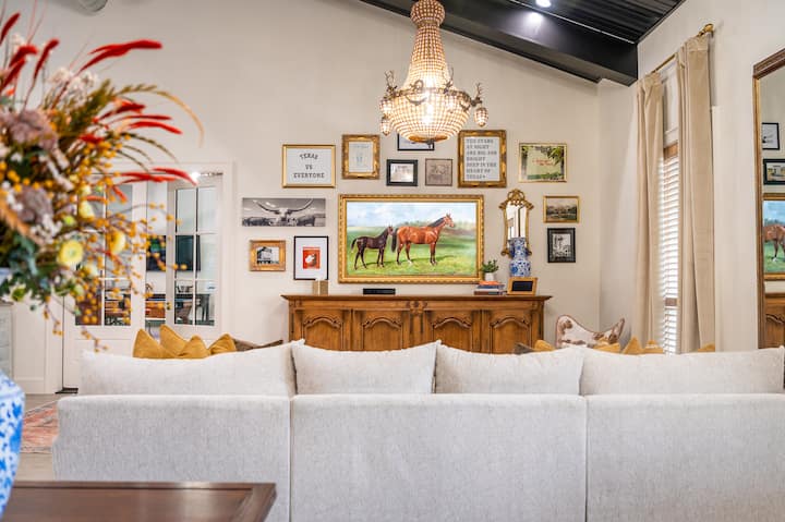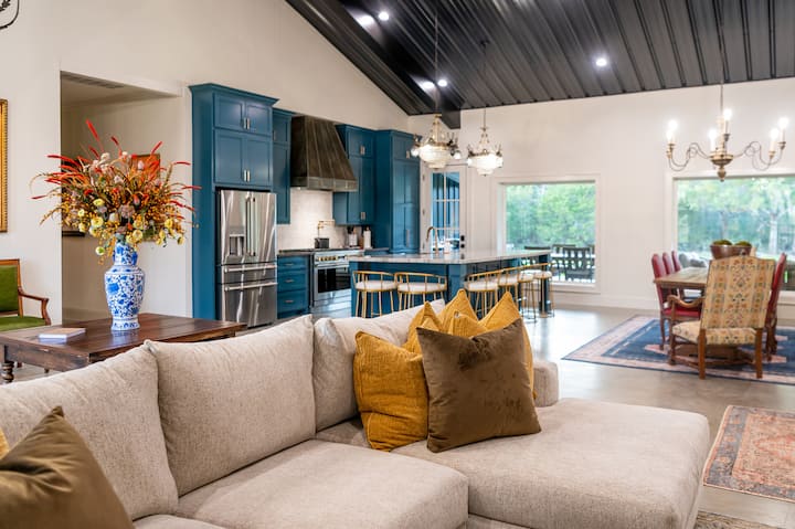 As you arrive at the property, you’ll take in the expansive front porch and entry welcoming you to your home away from home. This spacious 5 bedroom, 5.5 bathroom newly built home comfortably sleeps up to 14 people. Each bedroom has been named after a city in the Lone Star State and uniquely styled with vibrant colors, whimsical touches, and a blend of old and new designs. The rest of the home is elegantly styled with a fusion of antique character, rustic charm, and modern luxury throughout! There’s plenty of playful and interesting details that invoke a feeling of joy, serenity, and creativity.