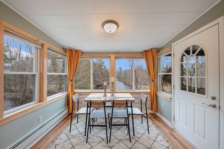 The house has a luxuriously large, private balcony directly facing the gorgeous White River which leads your access to the river. On the second floor, a wall-to-wall glass window adorned four-season dining room creates an unforgettable river view ambiance perfect for meal or game time. The interior of this rustic pad is pleasurably plush and modern; designed for the utmost comfort. Two floors of artistically curated space allow for plenty of private and comfy spaces to relax and enjoy quality time together. The ground floor living room has a wood-burning stove and direct view and access to the river view balcony. Two bedrooms, three beds, and one and a half baths can accommodate up to six guests perfectly. Access includes free onsite parking and laundry, tv and Wi-Fi, and more!