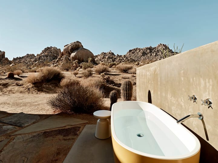 This exquisite cabin was designed by one of the leading modernist architects of our time, Ron Radziner, and is the ideal locale for a romantic escape or solo retreat. Modernist Cabin is on 5 acres surrounded by boulders, adjacent to Joshua Tree National Park. It seamlessly combines luxury w/ mid-century design and has been featured on the cover of the LA Times Home Section and in many books and magazines. A stay here is like staying inside the park, with unparalleled 360 degree desert vistas.