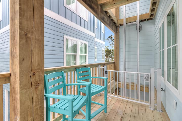 Easy beach access! Each house comes with fenced in private HEATED pool, a six seater gas golf cart, room for plenty of guests and grill! The beach is 3/4 mile away so you can pack gear and people on the golf cart and be there is less than 5 minutes! Shopping, restaurants, bars, and fishing are all less than a mile away! This is the perfect get away place. Spacious, well equipped kitchen with granite counters, lots of cabinets and storage open to living and dining area with high ceilings. Tile flooring throughout.