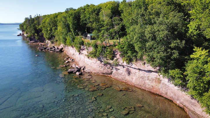 The Love Shack sits on a three acre wooded property with 500 front feet of dramatic 50 ft cliffs dropping to the crystal colors of Lake Superior. Three small buildings will be yours during your stay:
