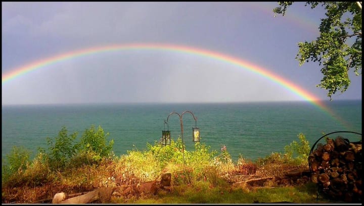 the hustle and bustle! Staying at this airbnb was an incredible experience. It is remote and off grid. Directions to the cabin were explicit and we had no trouble finding it. The roads leading to the cabin are upgraded and easy to travel. As we drove down the driveway to the cabin, there was an eagle soaring back and forth over the shore line. An auspicious welcoming! I am in love with Lake Superior, having lived in the area for many years, and missing it always. So, this was a treat to be RIGHT on the lake with a 180 degree view of the water! We were so fortunate to have the entire week of the most fabulous weather. Every morning was a stunning sunrise. We could literally open our eyes from bed and see the sunrise! At night, the stars were also BIG and present........if I woke up and opened my eyes, I could see the display of stars without even getting up. We enjoyed a few days of just BEING in the presence of the Big Lake, and felt every tension in the world lift away. We were also close to waterfalls, hikes, bike rides and close enough to get into Marquette or Big Bay for supplies. We enjoyed a couple of saunas while there, which was so pleasant. The cabin is on a 50 ft cliff, and is about 20 feet from the edge, so we do think, this is not the place to have children, dogs, or anyone who might not be very aware of the danger of the cliff. That said, we had no problem with it, and we felt like we were in a tree house over the enormous body of
