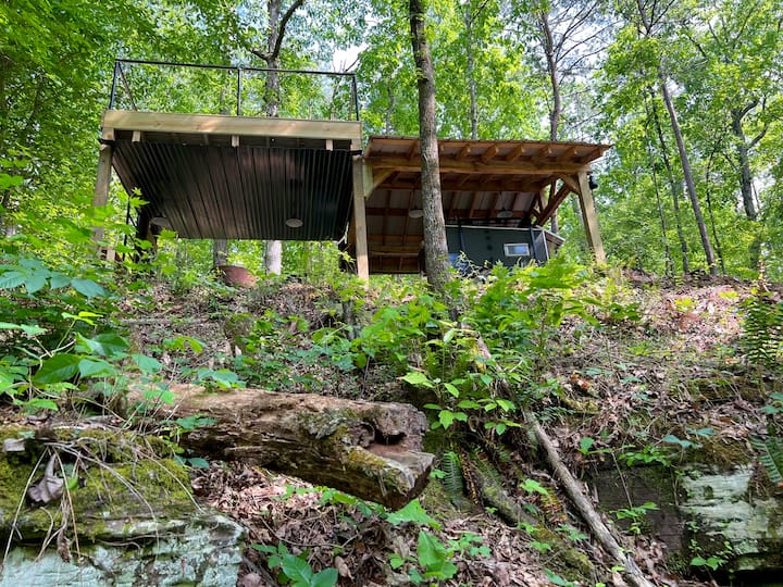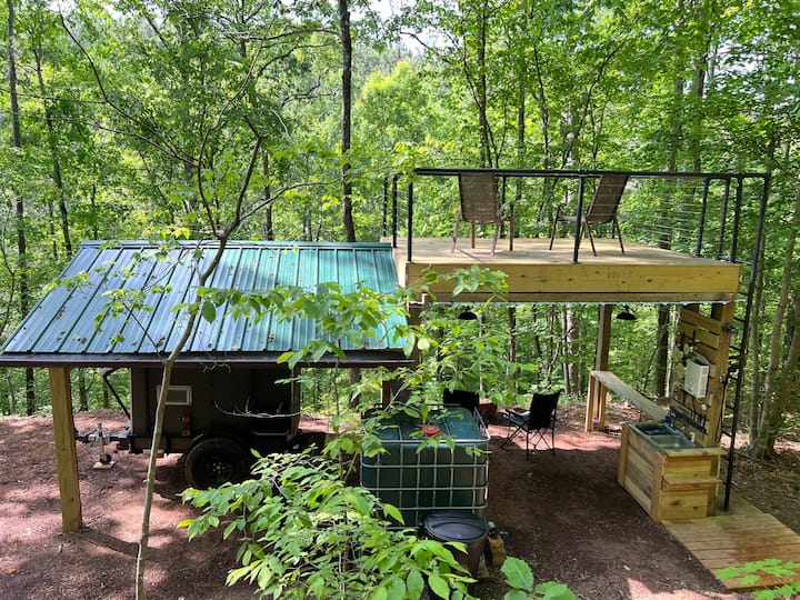 ▪︎ It's always a great time to escape your daily grind and come to Case Rock Eco-Retreat. Drive merely 30 min up the interstate from downtown Birmingham, and a short drive from the exit, you will park your car at the goat pen, throw your belongings in the back of our UTV, and one of our staff will transport you to the 105 acre sanctuary. The Microcamper sits under a covered pavilion overlooking the creek below. Expect daily visits from deer and other wildlife. The Microcamper features an outdoor kitchen, a heated rain water fed shower, fire pit, and a 10 foot observation deck overlooking the beautiful scenery below.