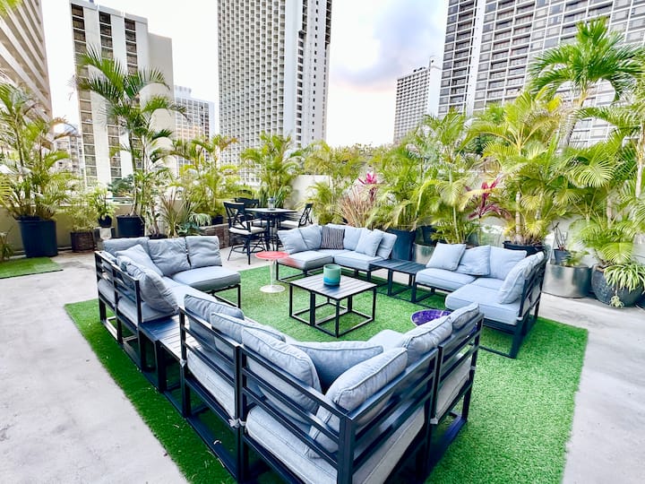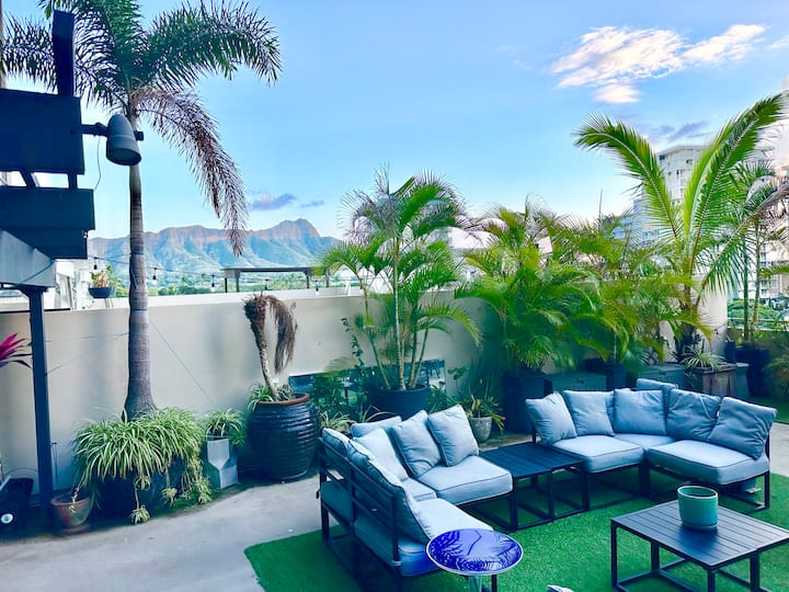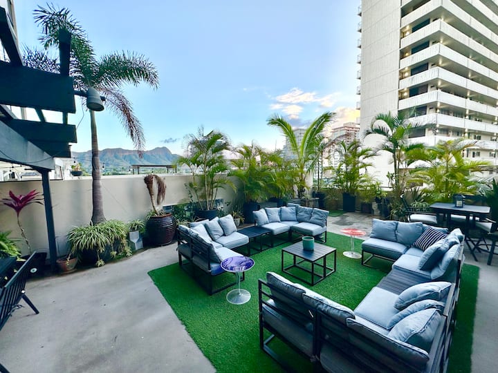 Escape to your very own tropical paradise in the heart of Waikiki! Our newly renovated, ultra-modern condo offers the perfect blend of luxury and comfort, featuring the largest private lanai (1,105 sq/ft) in the area! Picture yourself relaxing in a lush, landscaped sanctuary, enjoying the warm Hawaiian breeze, and soaking in the beauty of Diamond Head & island life. Whether you're starting your day with a cup of coffee & personal yoga/meditation practice in the morning or sipping cocktails & eating pupus during pau hana (Happy Hour) or dining al fresco in the evening, this is your perfect spot to relax and recharge with all the beautiful things Hawaii has to offer!