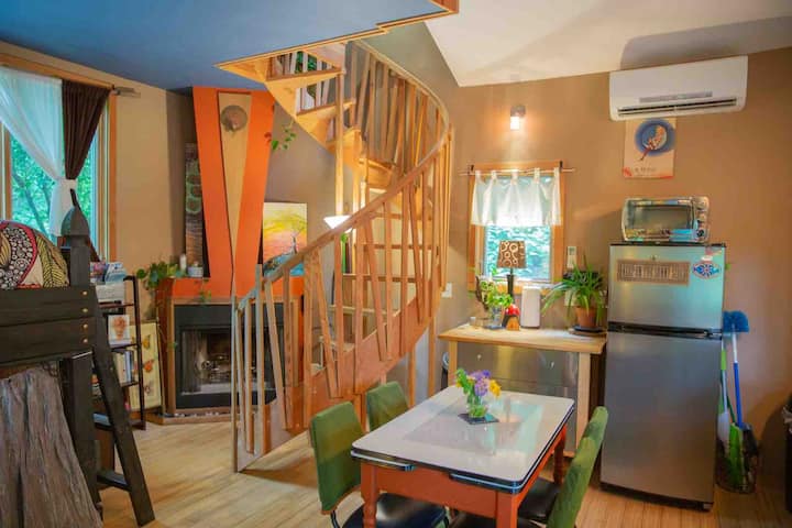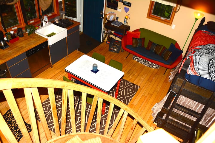 The "Moonbeam" Bungalow, is a one of a kind artsy 500sq ft tiny house that provides a unique "glamping" experience. The downstairs has a full kitchen, dining area, fireplace and a handmade queen bunk bed. The upstairs OPEN loft has a bathroom with a single lounge area for an additional guest.