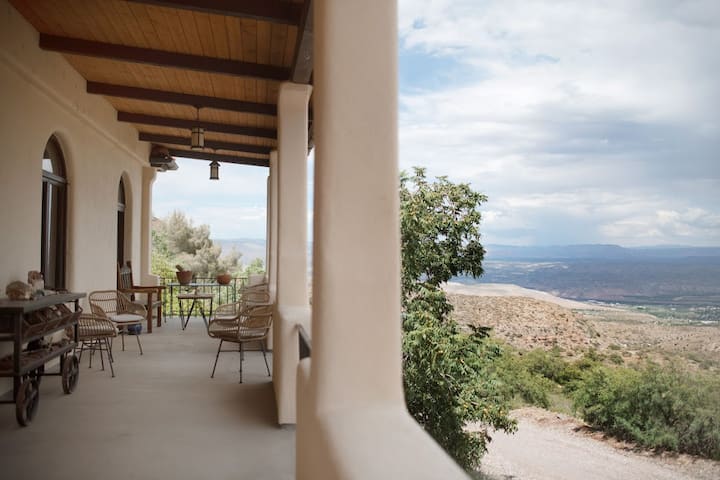 Whether you enjoy nature's show of snow falling gently down, clouds drifting by, sunrises and sunsets, or monsoon season with rains and rainbows, you will find that and more from the large front patio of The Geologist's House. You'll truly feel like you're in a high desert/ mountain dreamland as the ravens glide gently by. Our bright and airy home mimics the expanse and beauty of the surrounding desert with the rich blues of the sky and the orange rusts of the rocks. This 2-bedroom, 2-bath house works well for friends, couples, and families who want to experience all that Jerome has to offer. We can comfortably accommodate up to 8 guests. The top-floor master bedroom offers a king bed and our additional queen-size Murphy bed cabinet. The bottom-floor bedroom offers a full-size bed and a daybed that converts into a king-size bed. Also, downstairs, this property takes you back in time and comes with a surprise inside, a hidden gem - your very own “speakeasy” complete with red chandeliers and a sweet old-world loungy vibe. Everyone can meet there and unwind for an after-dinner cocktail.