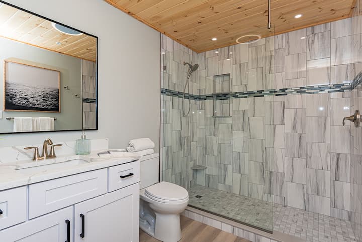 Huge walk in shower with glass door