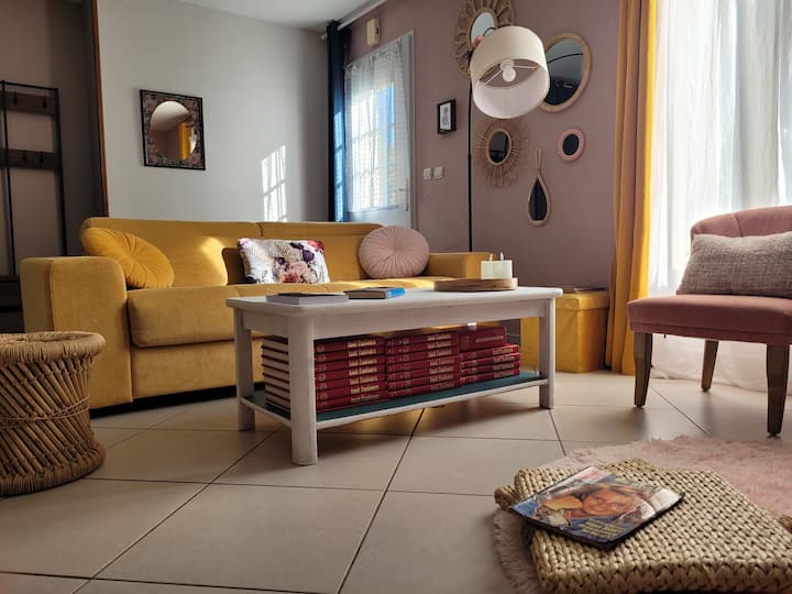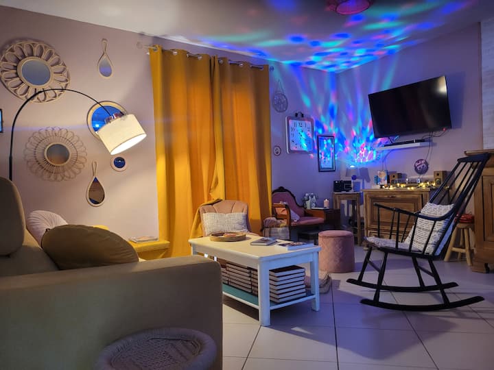 Single-story house with colorful decor and a cozy atmosphere, decorated with objects from the 80s or referring to them. Those who lived through this era will find their Proustian madeleine here, while the youngest will discover unusual objects.