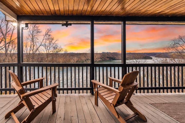The upper-level of our home boasts a spacious sun porch, offering a sunroom sanctuary where you can enjoy the lake view without the company of bugs. The extensive wood table caters to your dining and drinking needs, making it a favorite spot for casual meals or evening cocktails. Complete with a smart TV and comfortable lounge chairs, this area is your temp controlled living room with a view. Step outside to the deck for a BBQ feast or gather around the fire for a cozy end to your day, all against the backdrop of a stunning sunset.