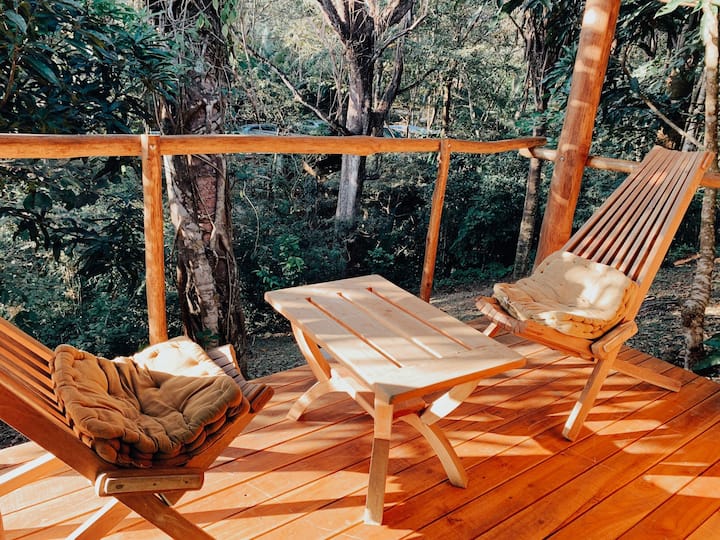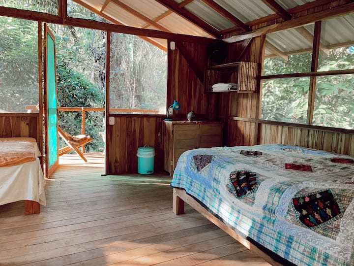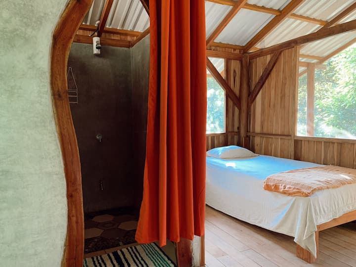 The casita offers a private bathroom, a queen bed, single bed and shelves. It also has a jungle facing deck outside, perfect for relaxation, meditation, yoga and connecting to nature!