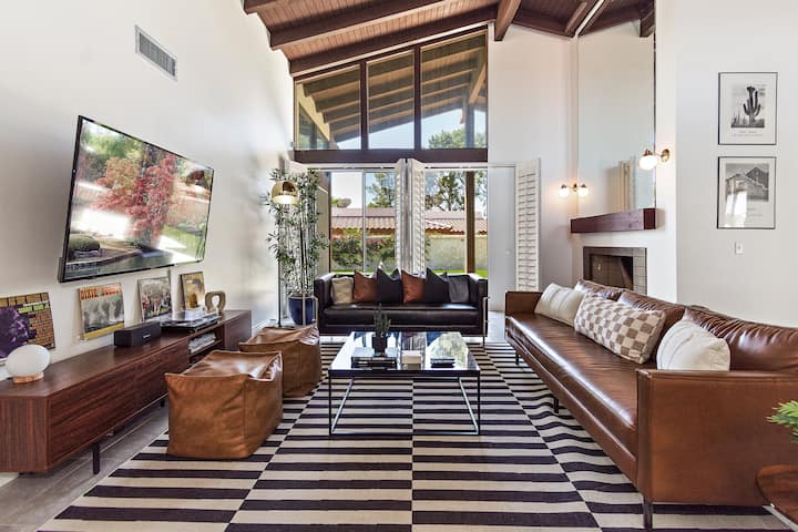 Our single-level home offers the perfect desert escape, featuring 3 bedrooms, each with private access, 2 bathrooms, and the ability to sleep up to 8 guests comfortably. The mid-century style and vaulted plank ceilings throughout the home add a touch of luxury to your stay. Water softening and filtration system feature throughout the home.