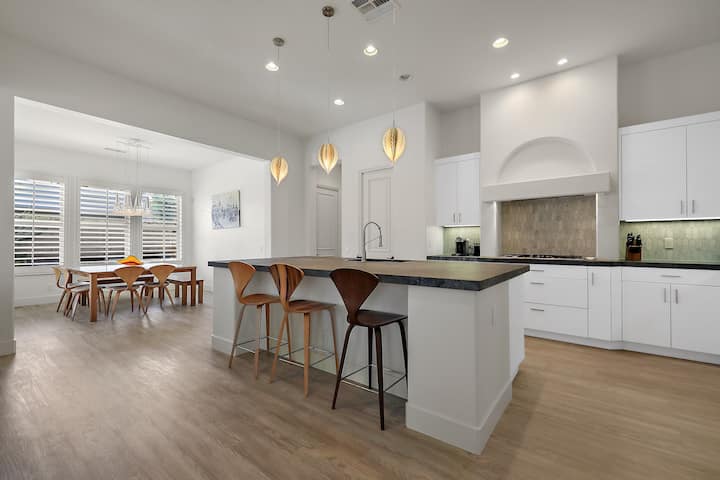Ideal bedding for up to six adults/two children. Spacious one floor with a Master Bedroom featuring a king bed and 65” Smart TV with apps guests can log in to their own accounts (Netflix, Youtube, Prime, etc.), an en-suite bathroom consisting of a sunken tub and a double vanity sink. Also includes a private sliding glass door leading out to the pool area along with a walk-in closet and work desk inside the closet. Bedroom #2, with a black & white theme, has a California king bed and 40” TV with Firestick for guest apps along with a private en-suite bathroom with shower. Bedroom #3 has a queen. Bedroom #4 features a two twin beds. Bathroom #3 includes a shower/tub combo. Bathroom #4 is a powder room by the entrance. Toiletries will be found in the bathrooms include shampoo, conditioner, and body wash.