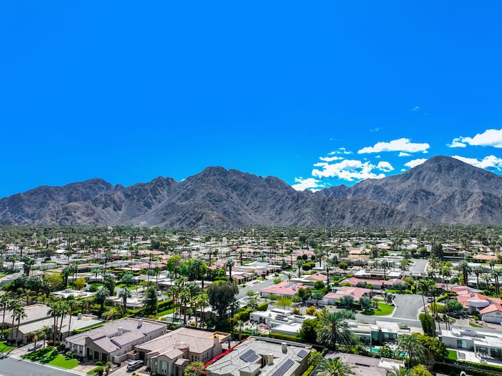 Indian Wells Fiore consists of 4-bedrooms, 3.5-bathrooms, a private 30ft in length salt water pool baja shelf for sun tanning and spa jacuzzi (optional guest paid heating available), a Fire Magic direct lined BBQ grill with built-in ice chest, pool floaties with inflator, outdoor shower, and more fabulous fun amenities! Kitchen features everything you need for the cook in you. Property is in the Montelena private, secure, and safe gated community with a private gate access to Miramonte resort, gym, and restaurant (guests can also use the resort's pool area). The use of the Miramonte Hotel recreational facilities is at the discretion of the hotel management and can be refused at any time. Home also features immaculate landscaping with desert cactus and succulents, and an abundance of magnificent mountain and sunrise/sunset views. Enjoy sipping coffee outside in the backyard with birds flying by mountain views then at night take in the perimeter yard lighting and pool lights for night swims or relaxing.