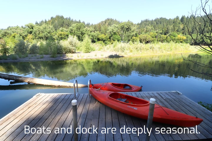 -About the Boats: USE BOATS AND BOATING GEAR AT YOUR OWN RISK. Boats are only be available as long as the dock is in. We provide two adult and two child life vests; additional can be purchased in Guerneville. All watercraft and equipment should be returned to their original locations and secured after each usage. Number and type of boats may vary. Note floaties in photos may or may not be available, even in season. B.Y.O.F (bring your own floaties).