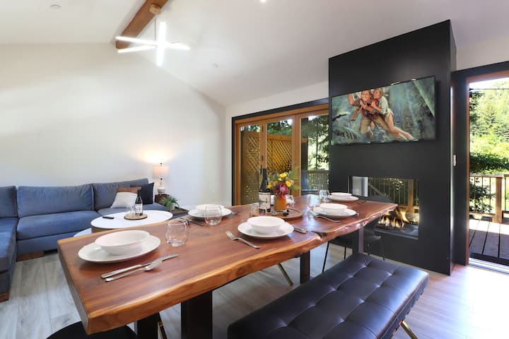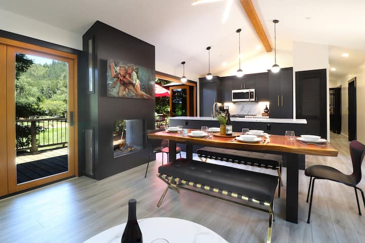 Toast to a Fabulous River Retreat beautifully and lovingly remodeled and expanded, Hot Tub, *Seasonal Dock & Boats (*See above for potential seasonal availability. ); Very Short Drive to Downtown Guerneville, Johnson's Beach (1.4 mi, windy, narrow, no sidewalks). Short Drive to Wine, Golf, Hiking, Coast. Wi-Fi, Landline, Streaming TV. Off-Street Parking, Go Direct. Your Well-Behaved Dog is Welcome!
