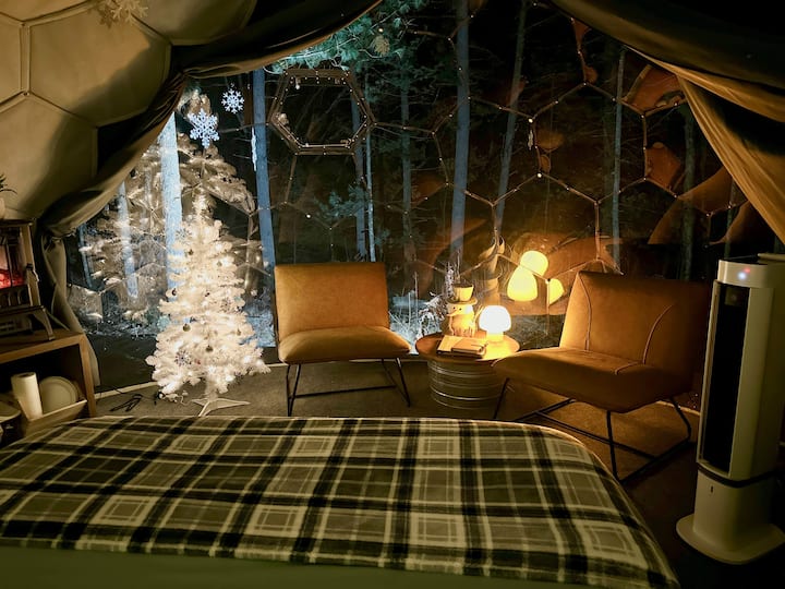 Staying in a dome amidst nature is a unique experience. The circular structure offers an amazing view of the surroundings, with peaceful sounds of rustling leaves, chirping birds, and a flowing river below. The cozy dome has a queen size bed, night stands, a seating area, mini fridge, and a k-cup coffee maker & heater/ac. At night, the starry sky and nature's sounds lull you to sleep. Waking up, you feel refreshed, and the peaceful surroundings and breathtaking views leave a lasting impression.