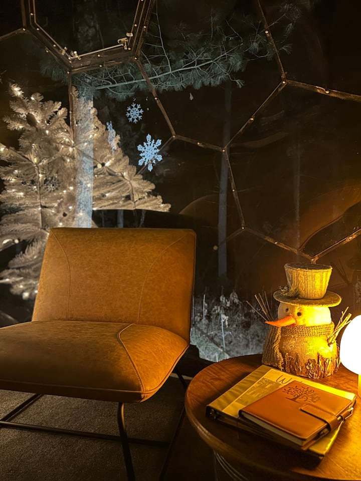 The dome itself is cozy and inviting, with all the amenities you need for a comfortable stay. A comfortable bed, nightstands, a seating area and a "Dome-a-Loo" (a portable toilet for any midnight emergencies) are all thoughtfully arranged within the dome's circular walls. The dome is elevated on a wooden platform and just outside your door you have a private fire pit and chairs to enjoy a warm fire and relax with a beverage.