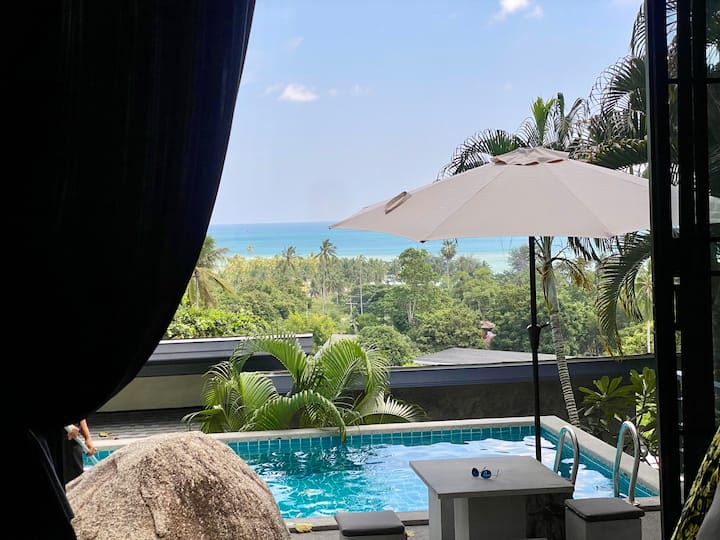 You have a private out door pool that has panoramic views of the evergreen jungle from the right, breath taking views of the Gulf of Thailand to the front and Lamai bay to the left.