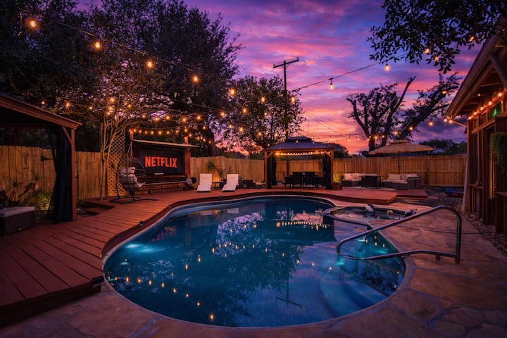 Experience tropical luxury in this 4-bedroom, 2-bath home, thoughtfully designed for relaxation and style. Located in the heart of Houston, this unique escape offers a private pool, outdoor entertainment spaces, and spacious interiors, making it the perfect stay for groups of up to 14 guests.