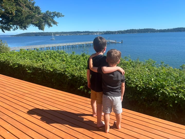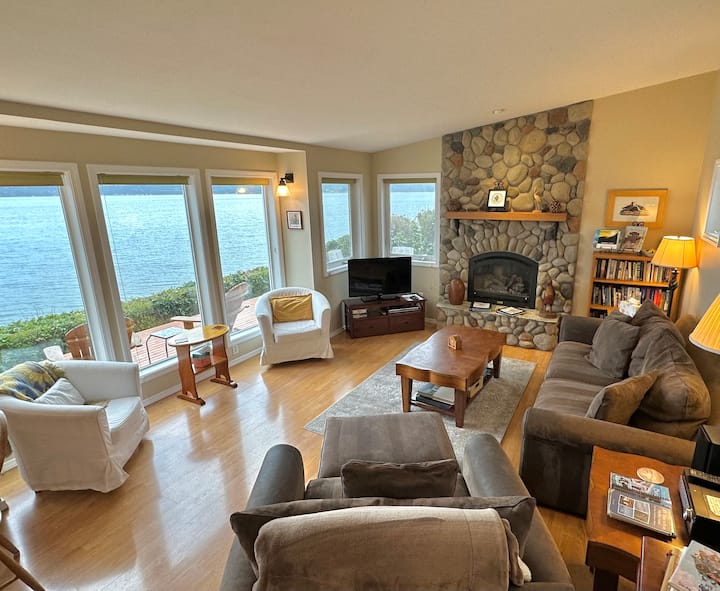 Nestled in a birdwatcher’s paradise, you can enjoy resident and migratory waterfowl, along with occasional visits from local bald eagles, seals, and otters. Relax on the expansive deck overlooking Penn Cove, sip morning coffee from our promontory, or roast s'mores by the fire pit. With private beach access just 20 steps away, explore miles of shoreline and take in breathtaking views of Penn Cove, and the Olympic and Cascade Mountains.