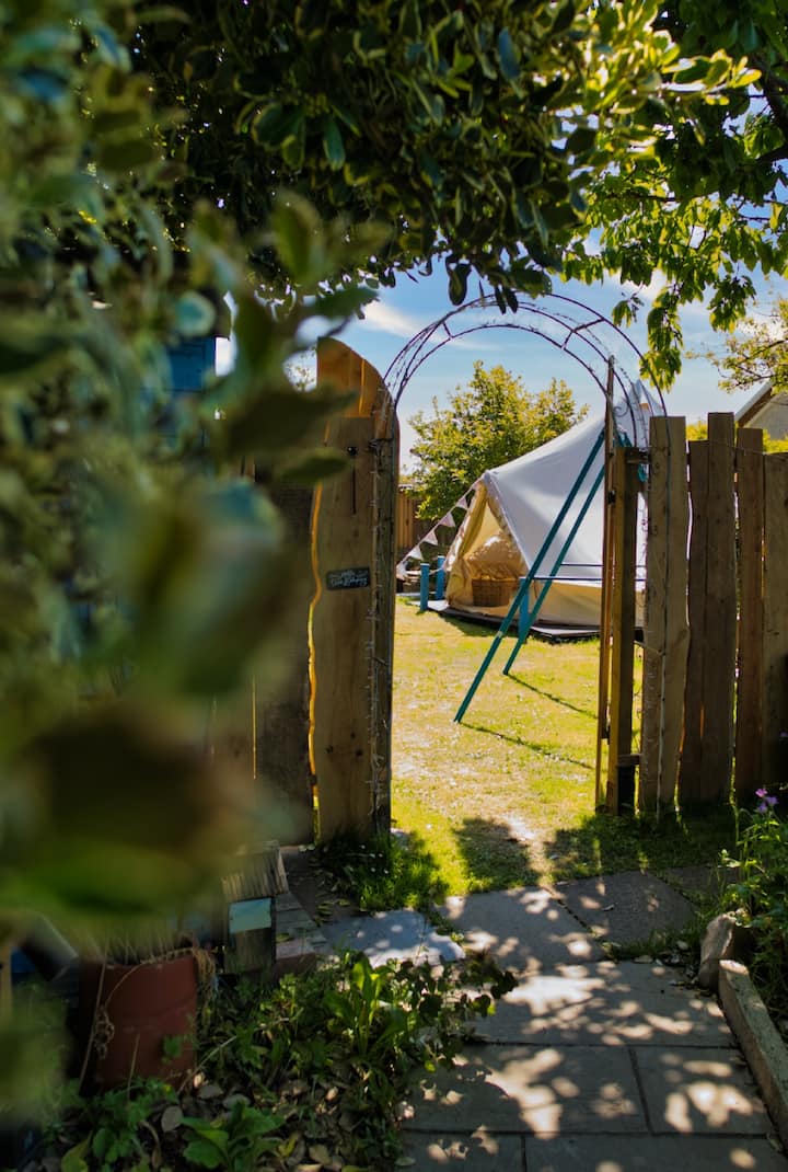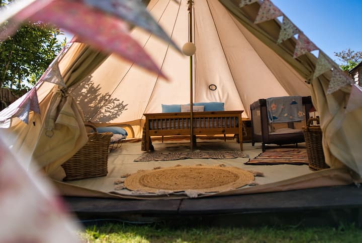 The 5m bell tent has soft flooring with rugs. There is a double bed with luxury linen, quilts and wool blankets and additional camp beds and travel cots can be provided also with luxury linen and quilts. There is a big dolls house and train set in the tent for early morning wide awake little ones, allowing the grown ups a lie in whilst they play. The tent is warm and waterproof and can be locked from the inside.