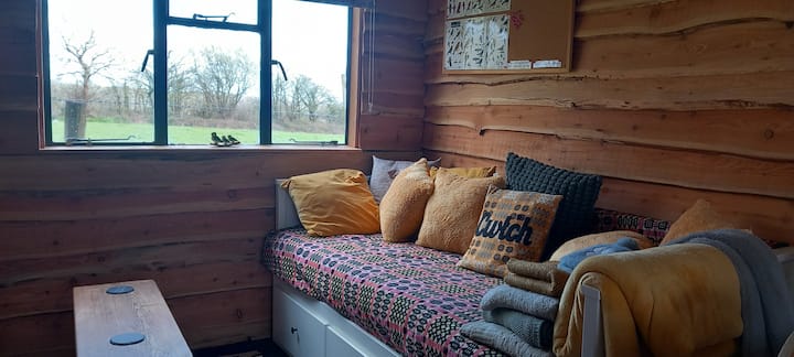 The cabin has board games, pens, pencils, and DVDs, a large day bed with lots of cushions and blankets to cwtch up on, and an electric wood burner to keep you cosy.