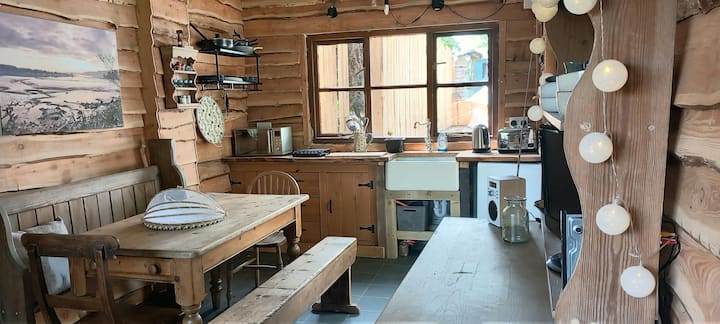 The larch cabin is a beautiful space. Its has a kitchen table that will seat 6, and high chairs if needed. It has an airfryer, hot plate, toaster and under counter fridge. There are pots pans, cutlery and crockery for 4 adults. There is a variety of children's crockery and cutlery. There are tea and coffee cups, glassware, salad bowls, serving spoons, knives and utensils and bottle and wine openers.