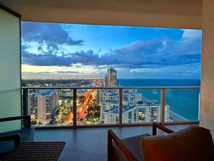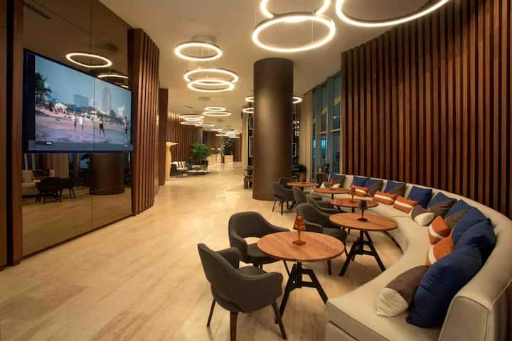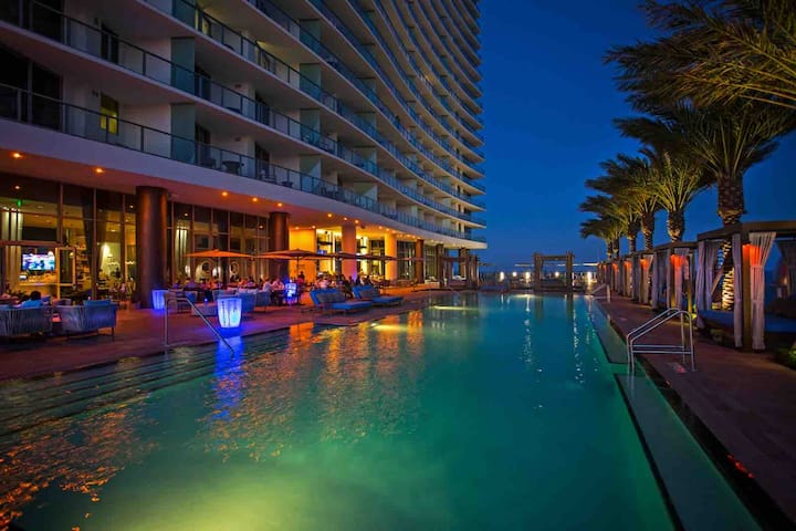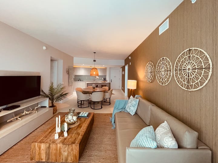 Wake up to ocean views and unwind with breathtaking sunsets in this stylish beachfront apartment. Enjoy resort amenities including a rooftop pool, spa, gym, dining, and beach service. The apartment features a full kitchen, washer and dryer, workspace, and a spacious balcony with views stretching from the beach to the iconic Guitar Hotel. Perfect for couples, families, or friends seeking comfort, style, and coastal relaxation.