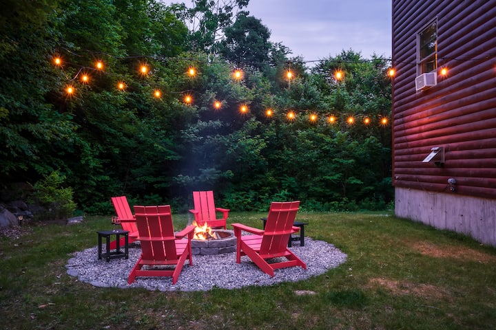 Soak in sweeping mountain views from 35 Hideaway Chalet, just 12 mins from Sunday River. Unwind in the barrel sauna or hot tub after adventures, then fire up the grill while kids swing and laugh. The epic game room buzzes with pool, ping pong, air hockey, and arcade fun. At dusk, sing karaoke before s’mores by the firepit under endless stars. Inside, enjoy a fully equipped chef’s kitchen, movie nights, and a cozy fireplace—your perfect mountain escape for family & friends. Bring your pups too!