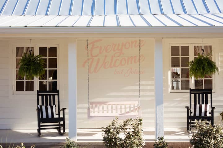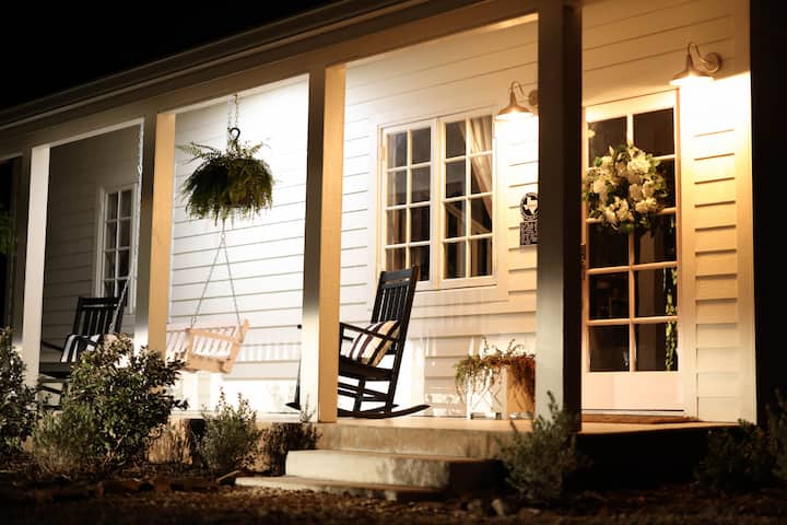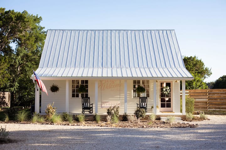 The Dolly Cottage is a classic Texas Farmhouse design with tall, vaulted ceilings, shiplap walls, with gold and brass accents. The cottage is located within 8Sages-Gruene, a large estate located just across the Guadalupe River from the center of historic Gruene. Positioned within the gated property, the cottage remains a private sanctuary with ample interior and exterior space to feel completely set apart from the estate as a whole. A mere golf cart ride from the heart of New Braunfels and Gruene, this luxury cottage is one of three uniquely designed, stand-alone, private two-bedroom, one bath, offerings complete with heated plunge pools, fire pit, enclosed patios and over 1200 sf each of hill country living. Perfect for couples’ getaways, large enough for small family stays, or rent as add-ons to the larger 3-acre estate of Texas limestone and ancient oaks. Come visit Gruene's newest and best luxury getaway!
