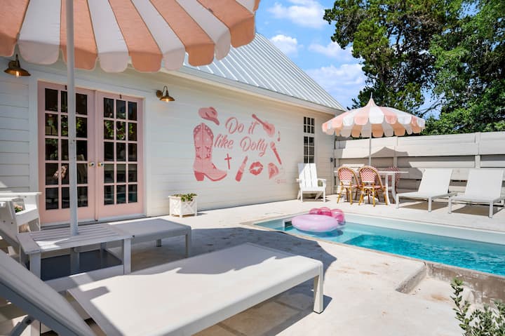 The front porch, adorned with rocking chairs and oversized swing, allows guests to enjoy their morning cup of coffee as well as afternoon views of the most beautiful Texas sunsets while enjoying a glass of wine! Guests will surely enjoy the dedicated private outdoor dining patio with seating for 4 guests. After dinner enjoy a cocktail around the lower-level fire pit in your own private lawn, with plenty of Adirondack chairs. Guests will enjoy the warmth and glow of evening fires while enjoying fireside chats, sunsets and late-night star gazing! Take a dip in the heated resort-style plunge pool. Bring your Bluetooth speakers, shake up a cocktail, pour your favorite drink and enjoy this glitzy Dolly inspired accommodation. Plenty of chaise lounges and umbrellas to relax in the shade on those hot Texas summer days and take a dip in the private pool or in the nearby Comal River.