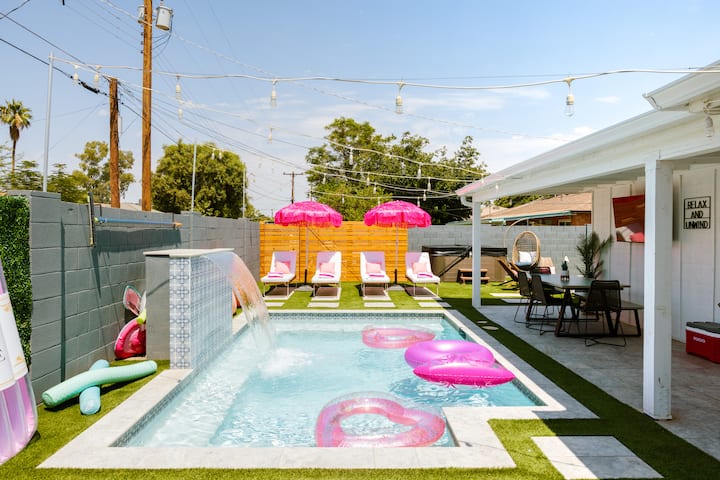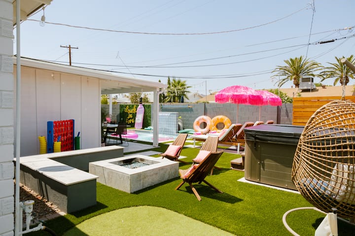 This perfect LUXE OASIS home has a resort inspired backyard, heated pool, & spa. Spend some time outside laying in the sun, relaxing in the pool or spa, or playing yard games with the main BACH! Feel like you have an entire resort just to your group! No expense was sparred when creating this newly renovated mid century property with every designer touch that you can expect in your perfect Scottsdale Bachelorette vacation home.