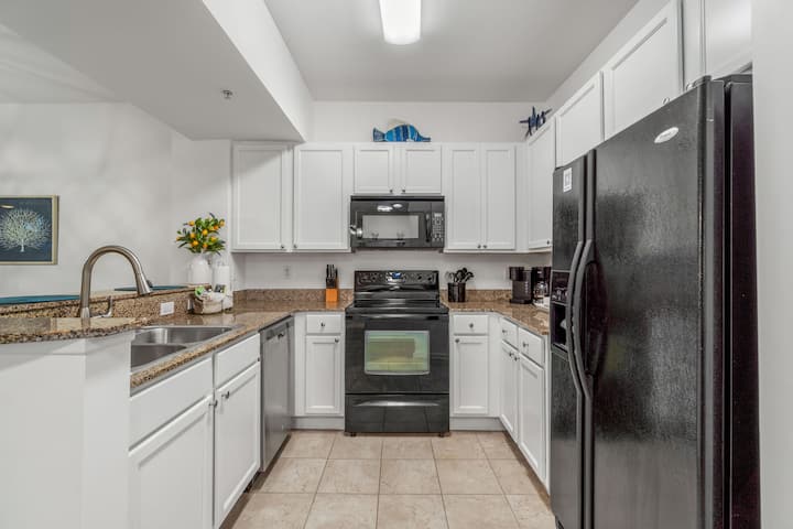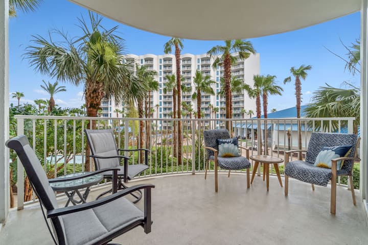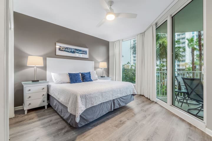 Enjoy the Pool Side Good Vibes Bar for food and cocktails, as well as a children’s splash pad, baby pool, state-of-the-art gym, tennis and pickleball courts, and a playground. With free shuttles to nearby restaurants, shopping, June White Decker Beach, boat and jet ski rentals, and the bustling boardwalk district, you'll be perfectly situated to explore renowned dining options such as Joe's Crab Shack, Bubba Gump's, Ruth's Chris, The Back Porch, and more.