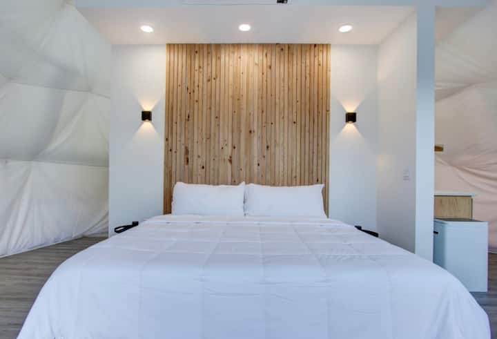 Our geodesic dome glamping unit offers a unique blend of luxury and nature, providing a beautiful and comfortable escape into the outdoors. While thoughtfully designed with upscale touches and a heating/cooling system for temperature regulation, please keep in mind that this is ultimately a tent, not a traditional home or hotel. As such, the experience will be different—closer to the natural elements and environment. To ensure your comfort, we kindly ask that you keep the door closed as much as possible to prevent insects from entering and to help the climate control system function effectively.