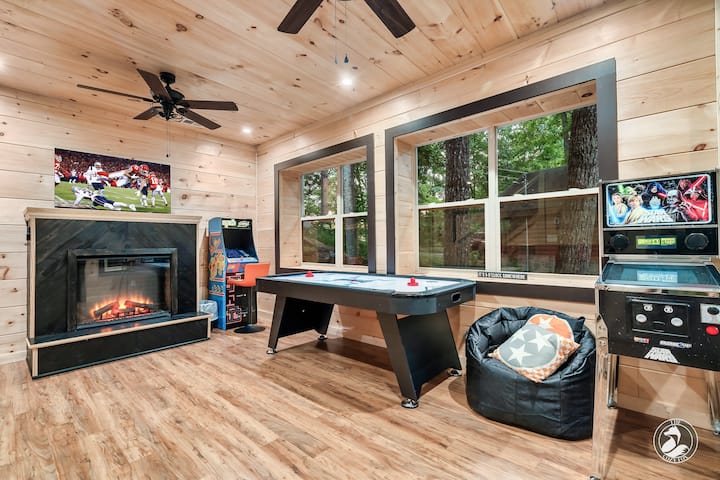❇️ Ultimate Game Room with Star Wars pinball, Mrs. Packman & Galaga arcade, air hockey, bar table, fireplace, Roku TV, board games and jumbo Connect 4!