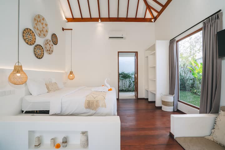 Villa L at Seseh offers 2-bedroom (each equipped with AC, a king sized bed, a flat screen tv, a dedicated working space, a closet with safety box, and its own private attached bathroom), a spacious open living room with a fully equipped kitchen, and a large private pool surrounded by a luxuriant tropical garden. Offering 24/7 service & assistance, and located in Seseh within walking distance (550m) to the beach, our villa is perfect for small groups or families traveling to Bali.