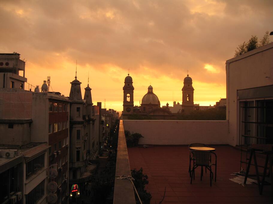 Great sunrise on the main avenue 18 Julio, and plaza Independencia and Palacio Salvo, and everyday changing sunset behind the church of Plaza matriz for admirating every night.