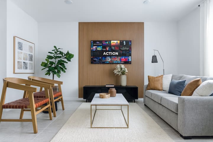 Next, unwind in the comfortable living room, designed for relaxation and entertainment. Sink into the cozy seating and enjoy your favorite shows or movies on one of the 3 Smart TVs available in the home, with streaming capabilities for everyone’s tastes.