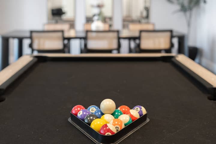 For indoor recreation, guests can challenge each other on the sleek black felt billiards table, creating another inviting space to relax and spend time together.