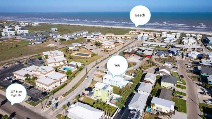 With its soaring ceilings, abundant windows filling open spaces with natural lighting, and special touches added specifically for your enjoyment, you wouldn’t want to spend your upcoming beach vacation anywhere else. Located just a block from the beach, trips to and from the shore will be a breeze. You’ll soon be basking in the warm Texas sun while listening to the waves gently lap ashore. A shared neighborhood pool offers a convenient option to cool off even closer to home or to get in a couple of morning laps before your daily adventures begin. The home is ADA-compliant and inclusive with ground floor access, kitchen and dining, and bedrooms. When you’re ready to find some shade, the outdoor palapa and bar is just the spot. The high-top chairs and built-in tables designed for enjoying afternoon cocktails will make you feel as though you’re in the middle of the Caribbean! Ready to spice things up a bit? The garage has been converted into a game room complete with a ping pong table and pool table. Additionally, the second floor lanai gives you a peek at the ocean plus a view out towards 11th Street where you can stay up to date on the action and easily access restaurants and bars.