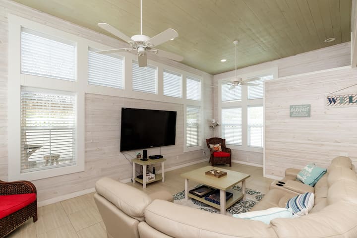 After exploring all these amazing outdoor spaces, the indoors will serve as the perfect relaxing retreat. The open floor plan on the ground level offers a wealth of space, seamlessly transitioning one room to the next and ensuring that everyone stays at the center of the action. Plush leather sofa seating in the living room surrounds a large smart TV, creating an immersive scene for a late-night movie. The generous, modern kitchen features glossy countertops and stainless steel appliances, inclusive of a Keurig coffee maker, blender, toaster, cookware, and dinnerware for all your mealtime needs. Gather the group around the dining room table with seating for 10 for formal meals or a rousing night of games. Additional high-top seating for 4 can be found at the kitchen counter for quick bites and appetizers alike. The second floor also invites you into another living space with comfy couches, smart TV, and view out onto the spacious lanai. If you want to dine outside, the second-floor lanai patio offers plentiful Adirondack seating, an ideal spot for morning sunrise coffee or for dinner watching the sunset, and a view.