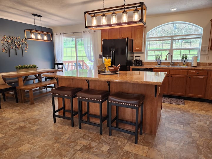The well-equipped kitchen is the heart of the cabin with an oversized center island perfect for gathering around during meal prep or dining. The kitchen also offers a full size refrigerator and freezer, dishwasher, sink, stove/oven and microwave. A coffee and tea bar is provided to you as well. Dining table seats six and we also provide you with a portable high chair and additional booster seat for the little ones.