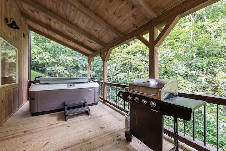 After exploring the nearby state park, filled with captivating waterfalls and caves, rejuvenate in the outdoor hot tub. Let its soothing waters melt away the day's fatigue as you revel in the tranquility of nature.