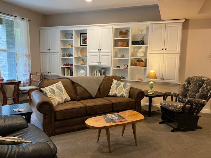 The apartment is the lower level of our home and includes the adjacent courtyard. Guests are welcome and encouraged to walk through the forest, check out the orchard and gardens, and sit in the gazebo down by the creek. We do ask that you stay out of the chicken house and visit the goats from your side of the fence until I have introduced you. Mark and I live in a separate space upstairs, so you’ll hear us patter around when we’re home, and some evenings the smell of our homegrown popcorn may waft downstairs.