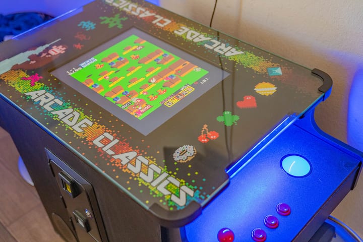 ✔ Two twin beds, classic 60-in-1 arcade game, closet, flat-screen TV, and fun energy with entertainment built right in