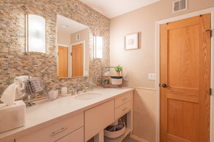 As our cherished guest, the entire space is at your disposal. You're welcome to park in the driveway or opt for street parking, whichever suits your convenience. The laundry room, complete with laundry detergent tabs, is accessible for your needs. Fresh towels and complimentary soaps are yours to enjoy. For the coffee aficionados among us, there's a well-stocked coffee bar waiting for your indulgence. Also take note of our Theme "Good Vibes Only." Feel free to illuminate the neon sign above the beverage bar and let positivity shine during your stay.